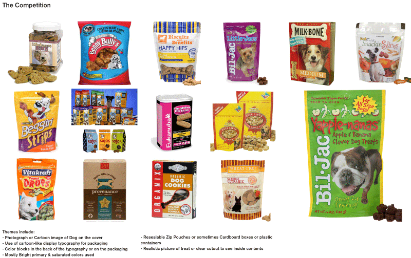 After doing research, the dog treat market is almost entirely made-up of low-grade product treats, and the packaging is loud and oversaturated. See some of the competition here: